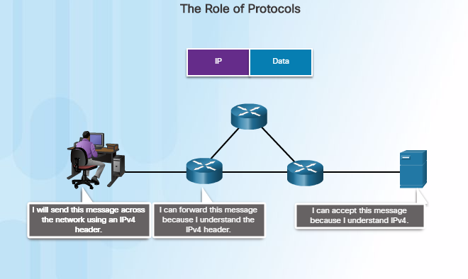 Before communicating with one another, individuals must use established rules or agreements to govern the conversation. For example, consider Figure 1, protocols are necessary for effective communication. These rules, or protocols, must be followed in order for the message to be successfully delivered and understood. Protocols must account for the following requirements: